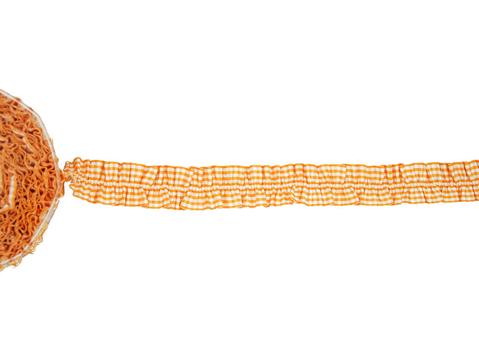 Bamby Con Elastico Centr. 25 MM Arancio Pesca. È un nastro a quadretti, detto anche vichy, adatto agli utilizzi per le decorazioni dei bambini, come i fiocchi di nascita bimbo e bimba, oppure, negli altri colori, per confezioni country e rustiche. In questa versione è presentato con l'elastico su un bordo a formare una rouge molto comoda da cucire. Codice colore# 41 - CONFEZIONATO IN BOBINA DA METRI 5
