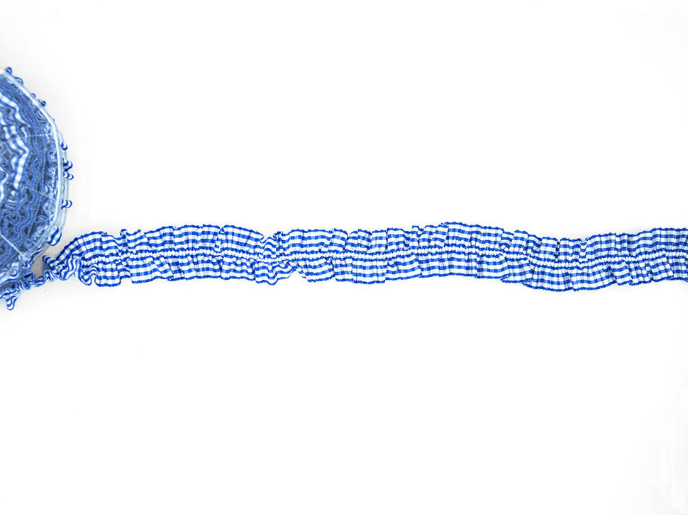 Bamby Con Elastico Centr. 25 MM Blu Scuro. È un nastro a quadretti, detto anche vichy, adatto agli utilizzi per le decorazioni dei bambini, come i fiocchi di nascita bimbo e bimba, oppure, negli altri colori, per confezioni country e rustiche. In questa versione è presentato con l'elastico su un bordo a formare una rouge molto comoda da cucire. Codice colore# 426 - CONFEZIONATO IN BOBINA DA METRI 5