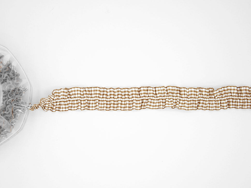 Bamby Con Elastico Centr. 25 MM Cannella. È un nastro a quadretti, detto anche vichy, adatto agli utilizzi per le decorazioni dei bambini, come i fiocchi di nascita bimbo e bimba, oppure, negli altri colori, per confezioni country e rustiche. In questa versione è presentato con l'elastico su un bordo a formare una rouge molto comoda da cucire. Codice colore# 55 - CONFEZIONATO IN BOBINA DA METRI 5