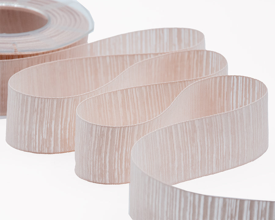 L’articolo N28 è un nastro dall’aspetto grezzo in cui si intravede una lavorazione a fiamma, i suoi bordi sono rinforzati quindi sono facili da lavorare e da modellare e mantengono la forma nel tempo per vari tipi di decorazione.