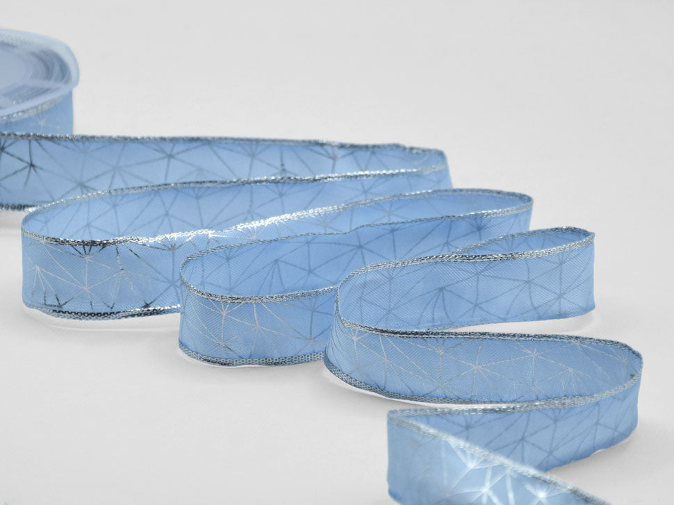 Carlotta Bordi Lurex Animati 25 mm Stampa Geometrico Azzurro Baby. Questo nastro taffetà, Carlotta, è setoso e lucido. Il suo tessuto è formato da fili sottilissimi che donano un aspetto particolarmente ricercato e il bordo in rame permette di fare confezioni perfette, ben modellate, particolarmente adatte per la pasticceria, la dolciaria, il cake-design e tutta la vetrinistica. Qui è presentato in una versione stampata con la tecnica di serigrafia laminata argento. Codice colore #593 - CONFEZIONATO IN BOBINA DA METRI 10