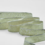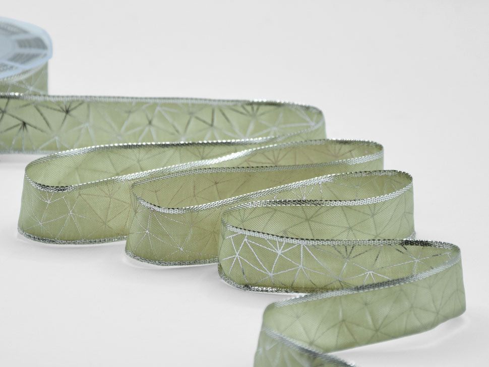 Carlotta Bordi Lurex Animati 25 mm Stampa Geometrico Salvia. Questo nastro taffetà, Carlotta, è setoso e lucido. Il suo tessuto è formato da fili sottilissimi che donano un aspetto particolarmente ricercato e il bordo in rame permette di fare confezioni perfette, ben modellate, particolarmente adatte per la pasticceria, la dolciaria, il cake-design e tutta la vetrinistica. Qui è presentato in una versione stampata con la tecnica di serigrafia laminata argento. Codice colore #15 - CONFEZIONATO IN BOBINA DA METRI 10