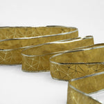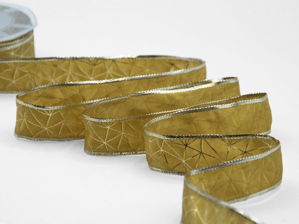 Carlotta Bordi Lurex Animati 25 mm Stampa Geometrico Senape. Questo nastro taffetà, Carlotta, è setoso e lucido. Il suo tessuto è formato da fili sottilissimi che donano un aspetto particolarmente ricercato e il bordo in rame permette di fare confezioni perfette, ben modellate, particolarmente adatte per la pasticceria, la dolciaria, il cake-design e tutta la vetrinistica. Qui è presentato in una versione stampata con la tecnica di serigrafia laminata oro. Codice colore #1085- CONFEZIONATO IN BOBINA DA METRI 10