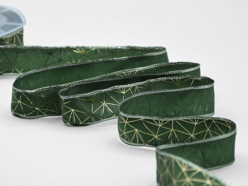 Carlotta Bordi Lurex Animati 25 mm Stampa Geometrico Verde Inglese. Questo nastro taffetà, Carlotta, è setoso e lucido. Il suo tessuto è formato da fili sottilissimi che donano un aspetto particolarmente ricercato e il bordo in rame permette di fare confezioni perfette, ben modellate, particolarmente adatte per la pasticceria, la dolciaria, il cake-design e tutta la vetrinistica. Qui è presentato in una versione stampata con la tecnica di serigrafia laminata oro. Codice colore #633 - CONFEZIONATO IN BOBINA DA METRI 10
