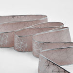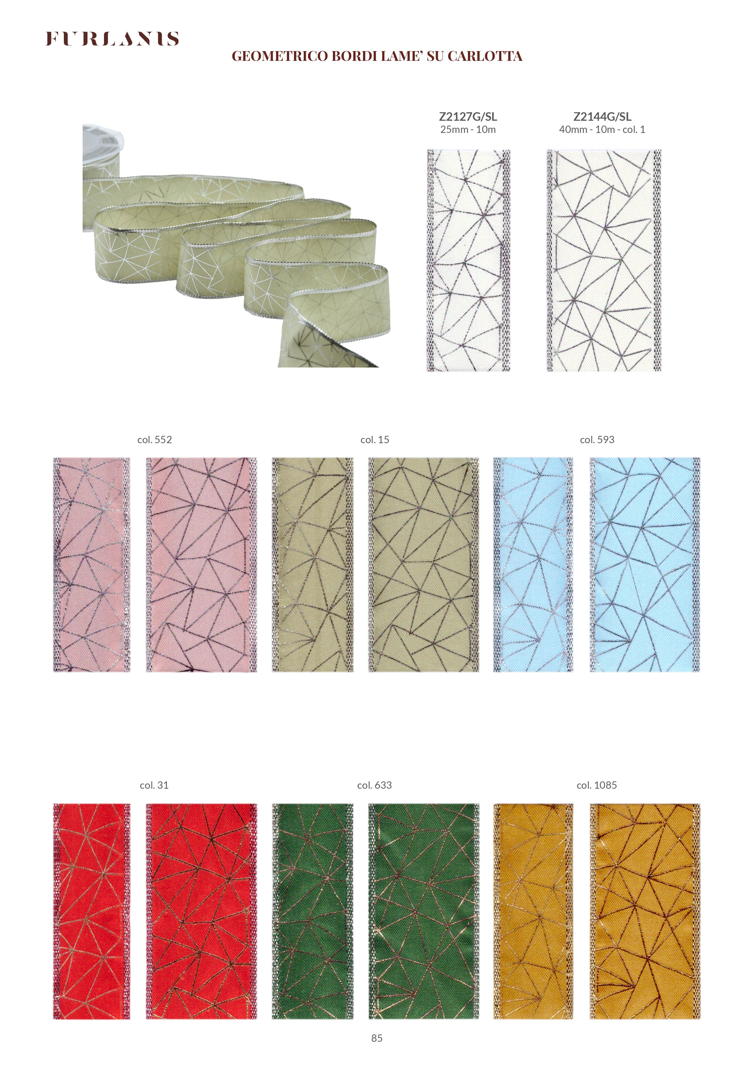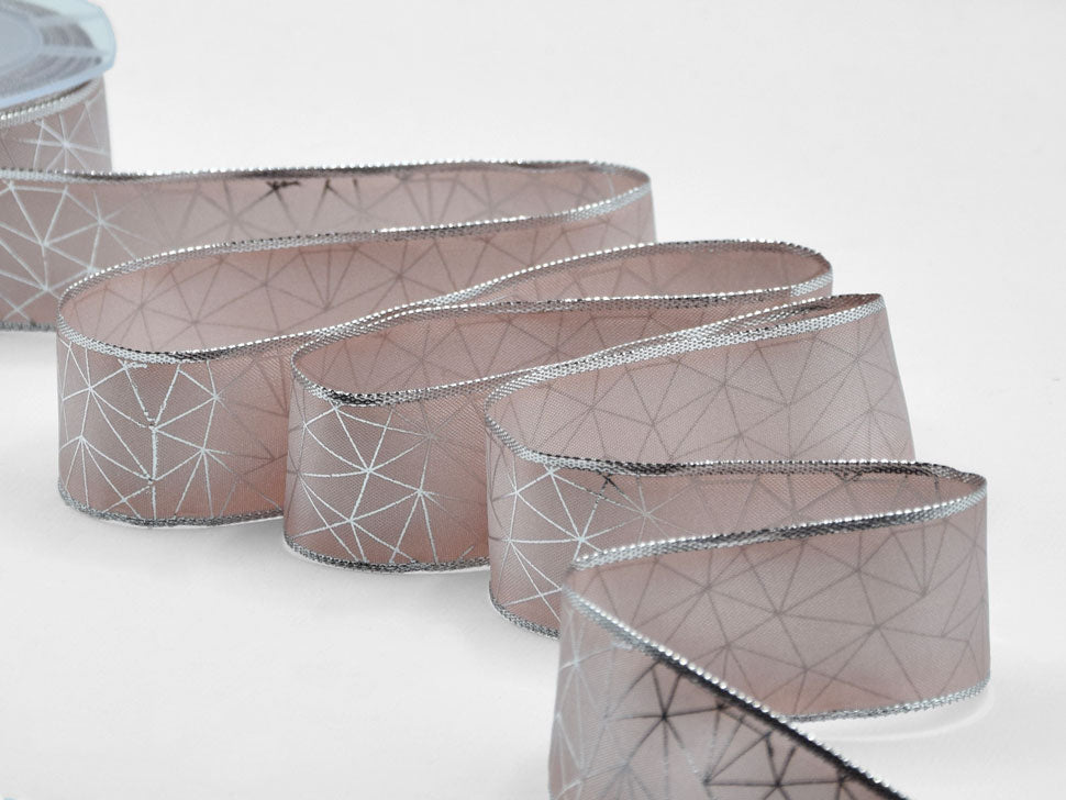 Carlotta Bordi Lurex Animati 40 mm Stampa Geometrico Cipria Scuro. Questo nastro taffetà, Carlotta, è setoso e lucido. Il suo tessuto è formato da fili sottilissimi che donano un aspetto particolarmente ricercato e il bordo in rame permette di fare confezioni perfette, ben modellate, particolarmente adatte per la pasticceria, la dolciaria, il cake-design e tutta la vetrinistica. Qui è presentato in una versione stampata con la tecnica di serigrafia laminata argento. Codice colore #552 - CONFEZIONATO IN BOBINA DA METRI 10