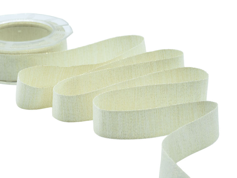 Clio Lurex 25 MM Oro. Questa magnifica variante del nostro nastro in cotone è caratterizzata dalla tramatura con filato lamè che da un lato dona un aspetto glitter al nastro, dall'altro un aspetto più elegante e raffinato con la presenza del lamè delicata e tenue. Il nastro Clio è adatto a tutte le confezioni per il Natale, alle nozze, alle celebrazioni eleganti e glamour.. Codice colore# 102 - CONFEZIONATO IN BOBINA DA METRI 10