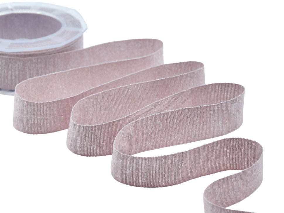 Clio Lurex 25 MM Rosa Baby. Questa magnifica variante del nostro nastro in cotone è caratterizzata dalla tramatura con filato lamè che da un lato dona un aspetto glitter al nastro, dall'altro un aspetto più elegante e raffinato con la presenza del lamè delicata e tenue. Il nastro Clio è adatto a tutte le confezioni per il Natale, alle nozze, alle celebrazioni eleganti e glamour.. Codice colore# 20 - CONFEZIONATO IN BOBINA DA METRI 10