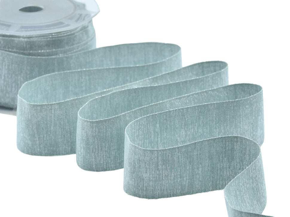 Clio Lurex 36 MM Azzurro Baby. Questa magnifica variante del nostro nastro in cotone è caratterizzata dalla tramatura con filato lamè che da un lato dona un aspetto glitter al nastro, dall'altro un aspetto più elegante e raffinato con la presenza del lamè delicata e tenue. Il nastro Clio è adatto a tutte le confezioni per il Natale, alle nozze, alle celebrazioni eleganti e glamour.. Codice colore# 593 - CONFEZIONATO IN BOBINA DA METRI 10