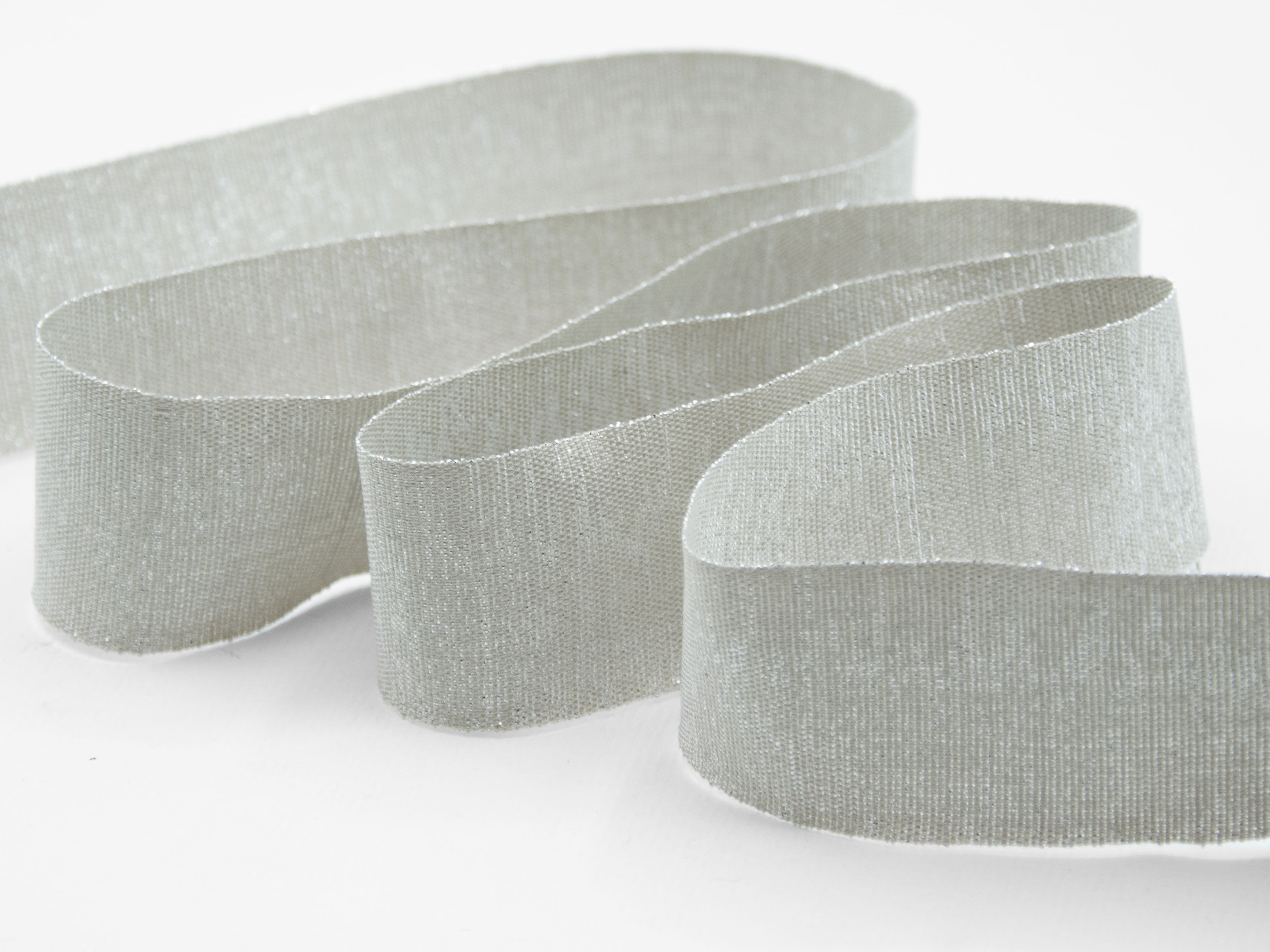 Clio Lurex 36 MM Grigio Perla. Questa magnifica variante del nostro nastro in cotone è caratterizzata dalla tramatura con filato lamè che da un lato dona un aspetto glitter al nastro, dall'altro un aspetto più elegante e raffinato con la presenza del lamè delicata e tenue. Il nastro Clio è adatto a tutte le confezioni per il Natale, alle nozze, alle celebrazioni eleganti e glamour.. Codice colore# 73 - CONFEZIONATO IN BOBINA DA METRI 10