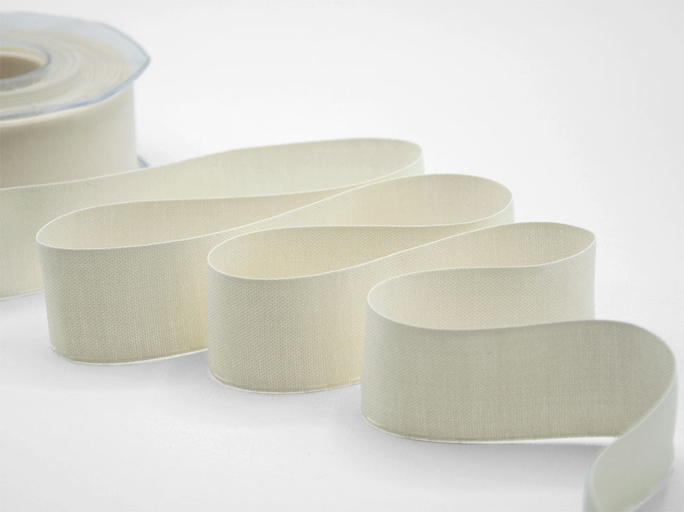 Coccardina Cotone 35 MM Latte. I nastri dotati di tirante laterale hanno un cordino sul bordo che viene utilizzato per creare le coccarde. Questa versione è di tipo COTONE. Codice colore# 30 - CONFEZIONATO IN BOBINA DA METRI 20