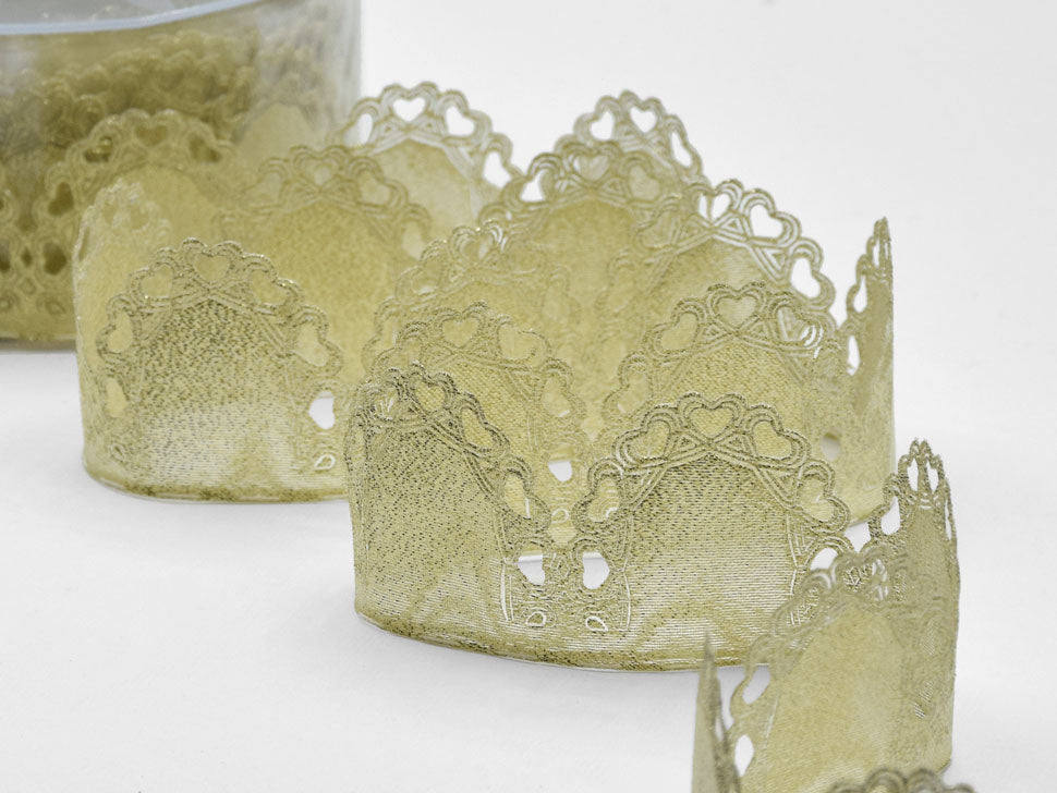 Cuore Portaconfetti Oro Argento 55 MM Oro. Il nastro portaconfetti permette di confezionare bomboniere o segnaposti in modo semplice e divertente. Venduto a rotolo da 10 o 25 metri, abbiamo calcolato che con una bobina di nastro da 10 metri e l'utilizzo di 5 petali per bomboniera, ovvero 26 cm di nastro portaconfetti, si possono realizzare circa 37 coccarde bomboniere. Facilissimo da lavorare, per confezionare la nostra coccarda basta srotolare il nastro, inserire in ogni petalo un confetto, tagliare il nastro dopo 5 tasche, afferrare i tiranti da entrambi i lati (due per ogni lato) tirare, ottenendo così in un semplice gesto dei bellissimi fiori margherita, con 5 petali e cinque confetti.