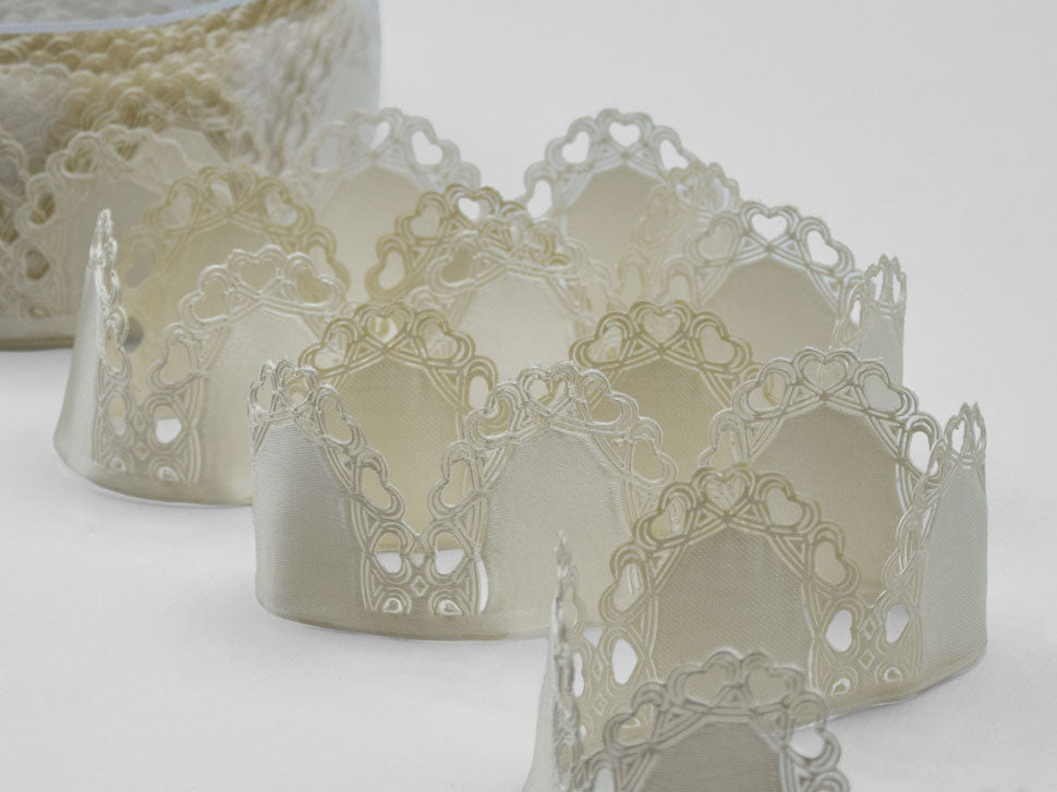Il nastro portaconfetti Cuore si presenta come nastro doppio, da un lato è una tela semiopaca e dall’altro è un velo trasparente, tagliato e bordato con disegni a forma di petali ripetuti a sequenza. Elegante, raffinato, morbido al tatto è adatto alla realizzazione di bomboniere fai da te per ogni tipo di occasione e di cerimonia: battesimo, comunione, cresima, laurea, matrimonio, diciottesimo, fidanzamento. Codice colore# 35 - CONFEZIONATO IN BOBINA DA METRI 10 o 25