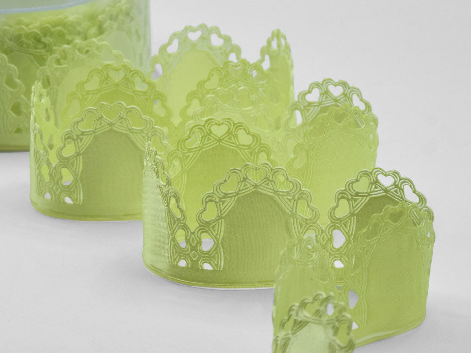 Cuore Portaconfetti 50 MM Verde Acido. Il nastro portaconfetti permette di confezionare bomboniere o segnaposti in modo semplice e divertente. Venduto a rotolo da 10 o 25 metri, abbiamo calcolato che con una bobina di nastro da 10 metri e l'utilizzo di 5 petali per bomboniera, ovvero 26 cm di nastro portaconfetti, si possono realizzare circa 37 coccarde bomboniere. Facilissimo da lavorare, per confezionare la nostra coccarda basta srotolare il nastro, inserire in ogni petalo un confetto, tagliare il nastro dopo 5 tasche, afferrare i tiranti da entrambi i lati (due per ogni lato) tirare, ottenendo così in un semplice gesto dei bellissimi fiori margherita, con 5 petali e cinque confetti.