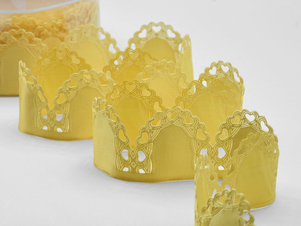Cuore Portaconfetti 50 MM Zafferano. Il nastro portaconfetti permette di confezionare bomboniere o segnaposti in modo semplice e divertente. Venduto a rotolo da 10 o 25 metri, abbiamo calcolato che con una bobina di nastro da 10 metri e l'utilizzo di 5 petali per bomboniera, ovvero 26 cm di nastro portaconfetti, si possono realizzare circa 37 coccarde bomboniere. Facilissimo da lavorare, per confezionare la nostra coccarda basta srotolare il nastro, inserire in ogni petalo un confetto, tagliare il nastro dopo 5 tasche, afferrare i tiranti da entrambi i lati (due per ogni lato) tirare, ottenendo così in un semplice gesto dei bellissimi fiori margherita, con 5 petali e cinque confetti.