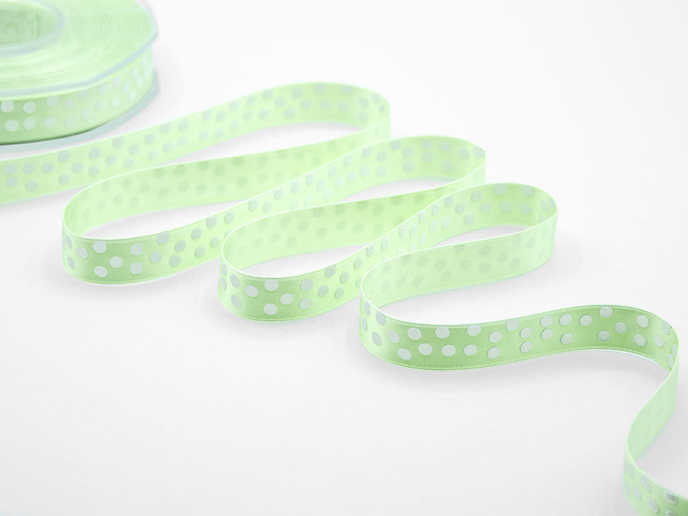 D.Raso 16 MM Stampa Pois Bianchi Verde Mela Chiaro. Il nastro elegante e raffinato per definizione è il doppio raso, qui è presentato in una variante stampata. È versatile e bello da lavorare e, nella sua semplicità, si presta ad ogni utilizzo. Essendo un prodotto di alta qualità si annoda molto facilmente formando un bel fiocco con le code che presentano un taglio netto e definito, che non si sfilaccia. Il suo aspetto è luminoso, consistente e corposo, ma al tatto è decisamente delicato e setoso. I suoi 16mm di altezza e le infinite possibilità di personalizzazione lo rendono un nastro ideale per molteplici utilizzi: dalla confezione di bomboniere di matrimoni e cerimonie alla decorazione dei fiori e della tavola; dalle confezioni regalo, anche natalizie, a tutti gli eventi di pregio.. Codice colore# 549 - CONFEZIONATO IN BOBINA DA METRI 20