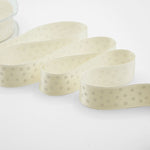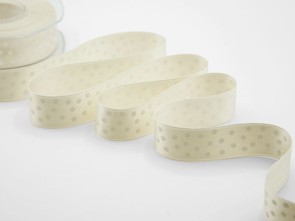 D.Raso 25 MM Stampa Pois Bianchi Avorio. Il nastro elegante e raffinato per definizione è il doppio raso, qui è presentato in una variante stampata. È versatile e bello da lavorare e, nella sua semplicità, si presta ad ogni utilizzo. Essendo un prodotto di alta qualità si annoda molto facilmente formando un bel fiocco con le code che presentano un taglio netto e definito, che non si sfilaccia. Il suo aspetto è luminoso, consistente e corposo, ma al tatto è decisamente delicato e setoso. I suoi 25mm di altezza e le infinite possibilità di personalizzazione lo rendono un nastro ideale per molteplici utilizzi: dalla confezione di bomboniere di matrimoni e cerimonie alla decorazione dei fiori e della tavola; dalle confezioni regalo, anche natalizie, a tutti gli eventi di pregio.. Codice colore# 35 - CONFEZIONATO IN BOBINA DA METRI 20