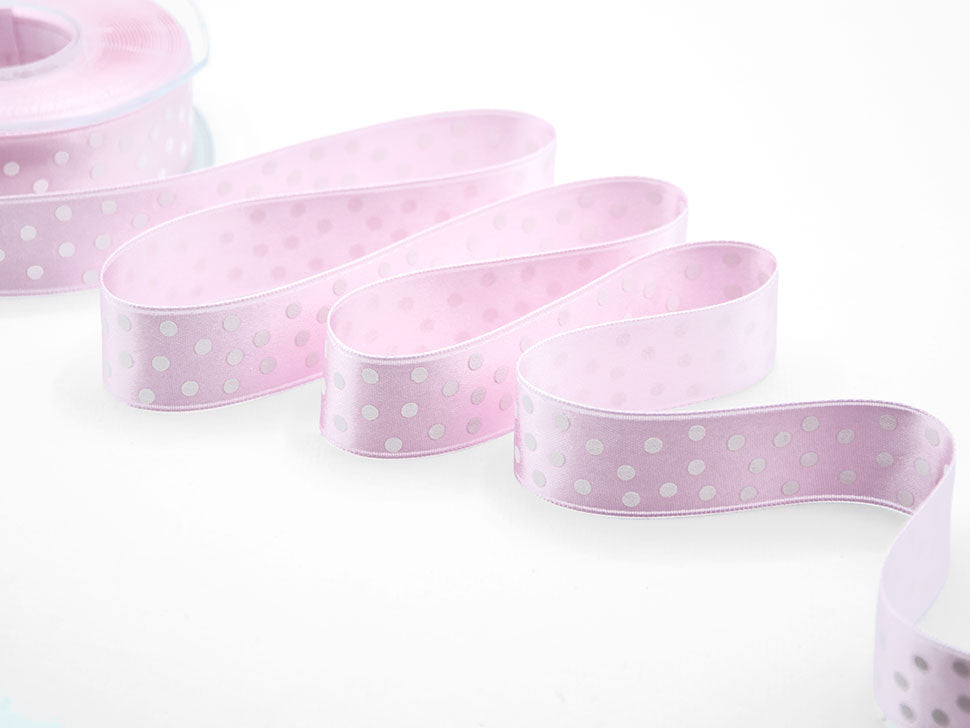 D.Raso 25 MM Stampa Pois Bianchi Rosa Baby. Il nastro elegante e raffinato per definizione è il doppio raso, qui è presentato in una variante stampata. È versatile e bello da lavorare e, nella sua semplicità, si presta ad ogni utilizzo. Essendo un prodotto di alta qualità si annoda molto facilmente formando un bel fiocco con le code che presentano un taglio netto e definito, che non si sfilaccia. Il suo aspetto è luminoso, consistente e corposo, ma al tatto è decisamente delicato e setoso. I suoi 25mm di altezza e le infinite possibilità di personalizzazione lo rendono un nastro ideale per molteplici utilizzi: dalla confezione di bomboniere di matrimoni e cerimonie alla decorazione dei fiori e della tavola; dalle confezioni regalo, anche natalizie, a tutti gli eventi di pregio.. Codice colore# 20 - CONFEZIONATO IN BOBINA DA METRI 20