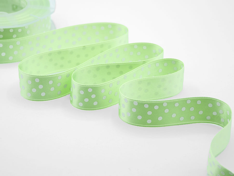 D.Raso 25 MM Stampa Pois Bianchi Verde Mela Chiaro. Il nastro elegante e raffinato per definizione è il doppio raso, qui è presentato in una variante stampata. È versatile e bello da lavorare e, nella sua semplicità, si presta ad ogni utilizzo. Essendo un prodotto di alta qualità si annoda molto facilmente formando un bel fiocco con le code che presentano un taglio netto e definito, che non si sfilaccia. Il suo aspetto è luminoso, consistente e corposo, ma al tatto è decisamente delicato e setoso. I suoi 25mm di altezza e le infinite possibilità di personalizzazione lo rendono un nastro ideale per molteplici utilizzi: dalla confezione di bomboniere di matrimoni e cerimonie alla decorazione dei fiori e della tavola; dalle confezioni regalo, anche natalizie, a tutti gli eventi di pregio.. Codice colore# 549 - CONFEZIONATO IN BOBINA DA METRI 20