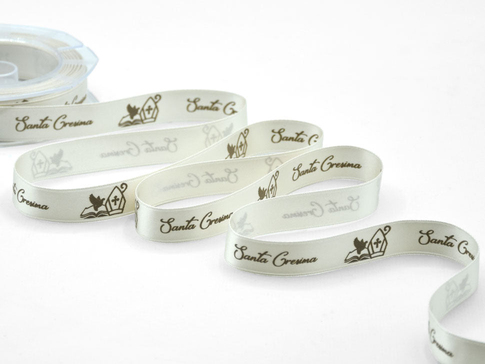 Doppio Raso 16 MM Serigrafia Cresima. Il nastro elegante e raffinato per definizione è il doppio raso, qui è presentato in una variante stampata. È versatile e bello da lavorare e, nella sua semplicità, si presta ad ogni utilizzo. Essendo un prodotto di alta qualità si annoda molto facilmente formando un bel fiocco con le code che presentano un taglio netto e definito, che non si sfilaccia. Il suo aspetto è luminoso, consistente e corposo, ma al tatto è decisamente delicato e setoso. I suoi 3mm di altezza e le infinite possibilità di personalizzazione lo rendono un nastro ideale per molteplici utilizzi: dalla confezione di bomboniere di matrimoni e cerimonie alla decorazione dei fiori e della tavola; dalle confezioni regalo, anche natalizie, a tutti gli eventi di pregio.. Codice colore# 20SD2 - CONFEZIONATO IN BOBINA DA METRI 10