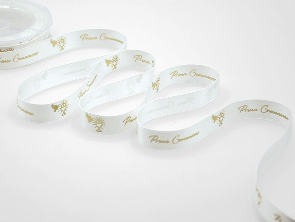 Doppio Raso 16 MM Stampa Comunione. Il nastro elegante e raffinato per definizione è il doppio raso, qui è presentato in una variante stampata. È versatile e bello da lavorare e, nella sua semplicità, si presta ad ogni utilizzo. Essendo un prodotto di alta qualità si annoda molto facilmente formando un bel fiocco con le code che presentano un taglio netto e definito, che non si sfilaccia. Il suo aspetto è luminoso, consistente e corposo, ma al tatto è decisamente delicato e setoso. I suoi 3mm di altezza e le infinite possibilità di personalizzazione lo rendono un nastro ideale per molteplici utilizzi: dalla confezione di bomboniere di matrimoni e cerimonie alla decorazione dei fiori e della tavola; dalle confezioni regalo, anche natalizie, a tutti gli eventi di pregio.. Codice colore# 20SC102 - CONFEZIONATO IN BOBINA DA METRI 10