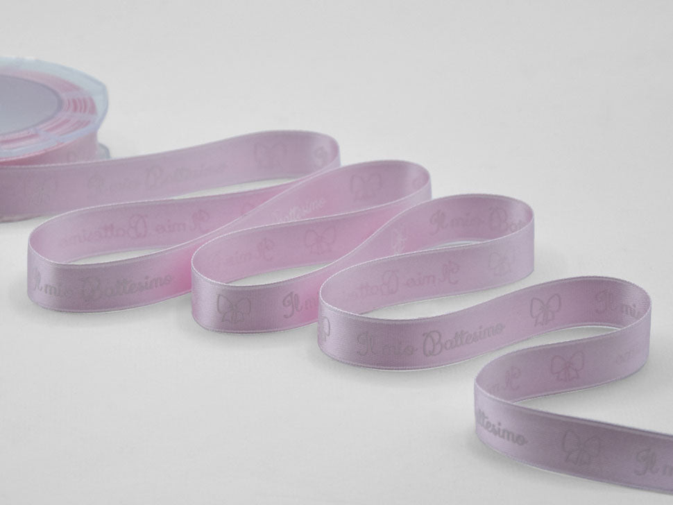 Doppio Raso 16 MM Stampa Il Mio Battesimo Rosa Baby. Il nastro elegante e raffinato per definizione è il doppio raso, qui è presentato in una variante stampata. È versatile e bello da lavorare e, nella sua semplicità, si presta ad ogni utilizzo. Essendo un prodotto di alta qualità si annoda molto facilmente formando un bel fiocco con le code che presentano un taglio netto e definito, che non si sfilaccia. Il suo aspetto è luminoso, consistente e corposo, ma al tatto è decisamente delicato e setoso. I suoi 3mm di altezza e le infinite possibilità di personalizzazione lo rendono un nastro ideale per molteplici utilizzi: dalla confezione di bomboniere di matrimoni e cerimonie alla decorazione dei fiori e della tavola; dalle confezioni regalo, anche natalizie, a tutti gli eventi di pregio.. Codice colore# 20SB20 - CONFEZIONATO IN BOBINA DA METRI 10