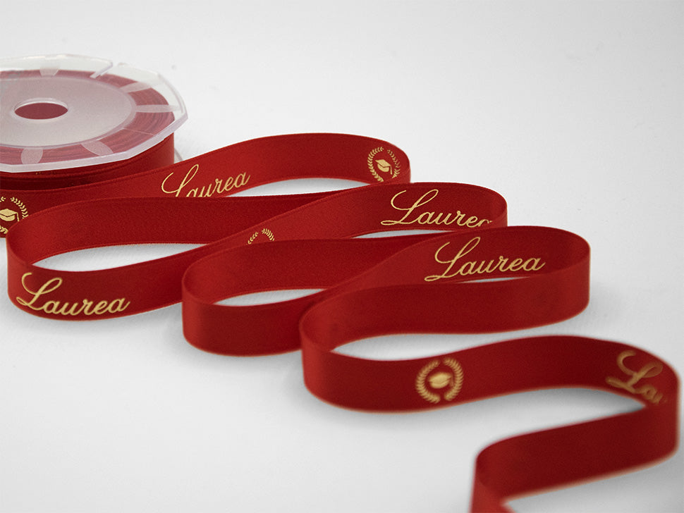 Doppio Raso 16 MM Stampa Laurea Oro Su Rosso. Il nastro elegante e raffinato per definizione è il doppio raso, qui è presentato in una variante stampata. È versatile e bello da lavorare e, nella sua semplicità, si presta ad ogni utilizzo. Essendo un prodotto di alta qualità si annoda molto facilmente formando un bel fiocco con le code che presentano un taglio netto e definito, che non si sfilaccia. Il suo aspetto è luminoso, consistente e corposo, ma al tatto è decisamente delicato e setoso. I suoi 3mm di altezza e le infinite possibilità di personalizzazione lo rendono un nastro ideale per molteplici utilizzi: dalla confezione di bomboniere di matrimoni e cerimonie alla decorazione dei fiori e della tavola; dalle confezioni regalo, anche natalizie, a tutti gli eventi di pregio.. Codice colore# 18L31 - CONFEZIONATO IN BOBINA DA METRI 10