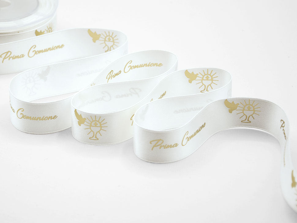 Doppio Raso 25 MM Stampa Comunione. Il nastro elegante e raffinato per definizione è il doppio raso, qui è presentato in una variante stampata. È versatile e bello da lavorare e, nella sua semplicità, si presta ad ogni utilizzo. Essendo un prodotto di alta qualità si annoda molto facilmente formando un bel fiocco con le code che presentano un taglio netto e definito, che non si sfilaccia. Il suo aspetto è luminoso, consistente e corposo, ma al tatto è decisamente delicato e setoso. I suoi 3mm di altezza e le infinite possibilità di personalizzazione lo rendono un nastro ideale per molteplici utilizzi: dalla confezione di bomboniere di matrimoni e cerimonie alla decorazione dei fiori e della tavola; dalle confezioni regalo, anche natalizie, a tutti gli eventi di pregio.. Codice colore# 20SC102 - CONFEZIONATO IN BOBINA DA METRI 10