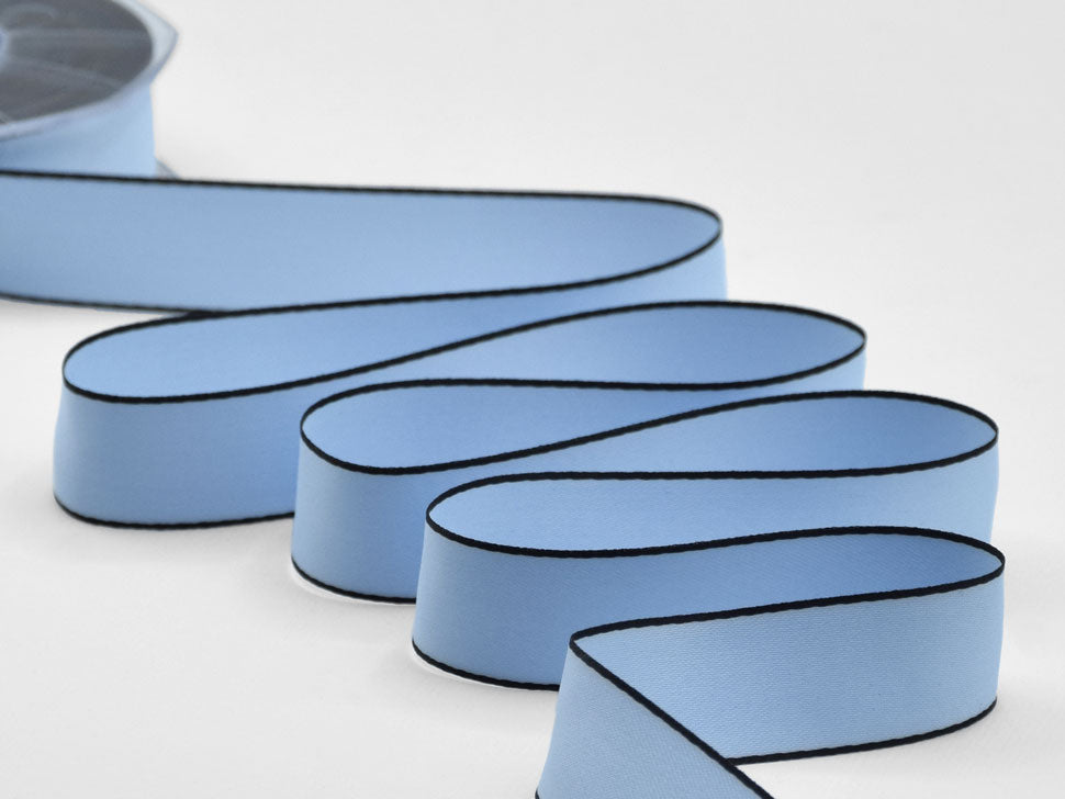 Doppio Raso Opaco Bordi Neri 25 MM Azzurro Baby. Se il doppio raso Furlanis è il protagonista del confezionamento, il Doppio Raso Opaco Furlanis ne sublima la sua fama esaltando tutti i pregi con l'aggiunta di questo tocco setoso opaco estremamente raffinato. È un nastro tessuto con moltissimi fili tipo seta, morbidissimo, adatto a qualsiasi stampa, con code dal taglio netto estremamente preciso, bellissimo da lavorare, molto attuale.. Qui è presentata una versione con bordi neri. Codice colore #593 - CONFEZIONATO IN BOBINA DA METRI 20