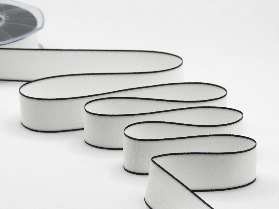 Doppio Raso Opaco Bordi Neri 25 MM Bianco Naturale. Se il doppio raso Furlanis è il protagonista del confezionamento, il Doppio Raso Opaco Furlanis ne sublima la sua fama esaltando tutti i pregi con l'aggiunta di questo tocco setoso opaco estremamente raffinato. È un nastro tessuto con moltissimi fili tipo seta, morbidissimo, adatto a qualsiasi stampa, con code dal taglio netto estremamente preciso, bellissimo da lavorare, molto attuale.. Qui è presentata una versione con bordi neri. Codice colore #1 - CONFEZIONATO IN BOBINA DA METRI 20