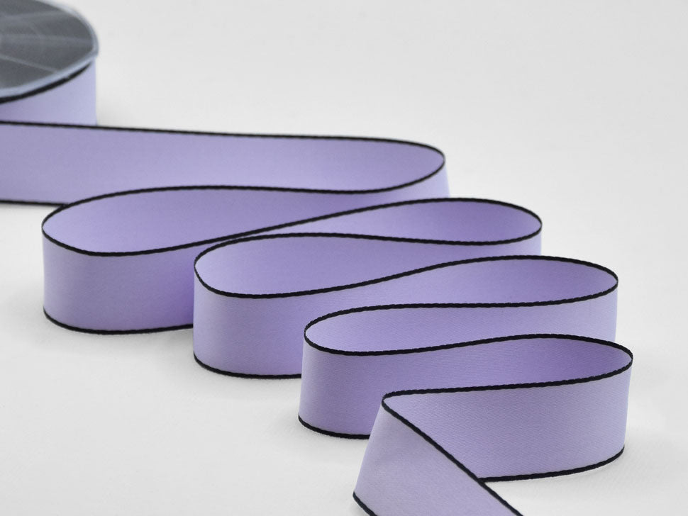 Doppio Raso Opaco Bordi Neri 25 MM Lilla. Se il doppio raso Furlanis è il protagonista del confezionamento, il Doppio Raso Opaco Furlanis ne sublima la sua fama esaltando tutti i pregi con l'aggiunta di questo tocco setoso opaco estremamente raffinato. È un nastro tessuto con moltissimi fili tipo seta, morbidissimo, adatto a qualsiasi stampa, con code dal taglio netto estremamente preciso, bellissimo da lavorare, molto attuale.. Qui è presentata una versione con bordi neri. Codice colore #67 - CONFEZIONATO IN BOBINA DA METRI 20