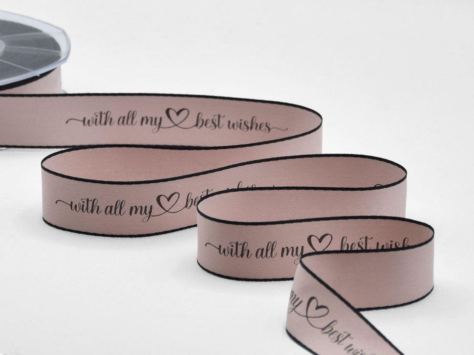 Doppio Raso Opaco Bordi Neri 25 MM Stampa "With all my best wishes" Rosa Cipria. Se il doppio raso Furlanis è il protagonista del confezionamento, il Doppio Raso Opaco Furlanis ne sublima la sua fama esaltando tutti i pregi con l'aggiunta di questo tocco setoso opaco estremamente raffinato. È un nastro tessuto con moltissimi fili tipo seta, morbidissimo, adatto a qualsiasi stampa, con code dal taglio netto estremamente preciso, bellissimo da lavorare, molto attuale.. Qui è presentata una versione con bordi neri e stampa offset. Codice colore #552 - CONFEZIONATO IN BOBINA DA METRI 10