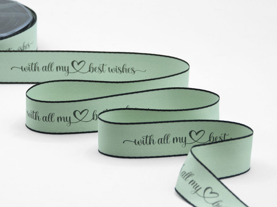 Doppio Raso Opaco Bordi Neri 25 MM Stampa "With all my best wishes" Verde Mare. Se il doppio raso Furlanis è il protagonista del confezionamento, il Doppio Raso Opaco Furlanis ne sublima la sua fama esaltando tutti i pregi con l'aggiunta di questo tocco setoso opaco estremamente raffinato. È un nastro tessuto con moltissimi fili tipo seta, morbidissimo, adatto a qualsiasi stampa, con code dal taglio netto estremamente preciso, bellissimo da lavorare, molto attuale.. Qui è presentata una versione con bordi neri e stampa offset. Codice colore #9 - CONFEZIONATO IN BOBINA DA METRI 10