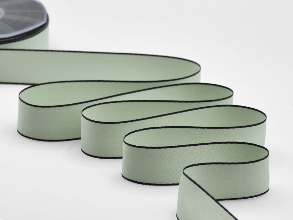 Doppio Raso Opaco Bordi Neri 25 MM Verde Mare. Se il doppio raso Furlanis è il protagonista del confezionamento, il Doppio Raso Opaco Furlanis ne sublima la sua fama esaltando tutti i pregi con l'aggiunta di questo tocco setoso opaco estremamente raffinato. È un nastro tessuto con moltissimi fili tipo seta, morbidissimo, adatto a qualsiasi stampa, con code dal taglio netto estremamente preciso, bellissimo da lavorare, molto attuale.. Qui è presentata una versione con bordi neri. Codice colore #9 - CONFEZIONATO IN BOBINA DA METRI 20