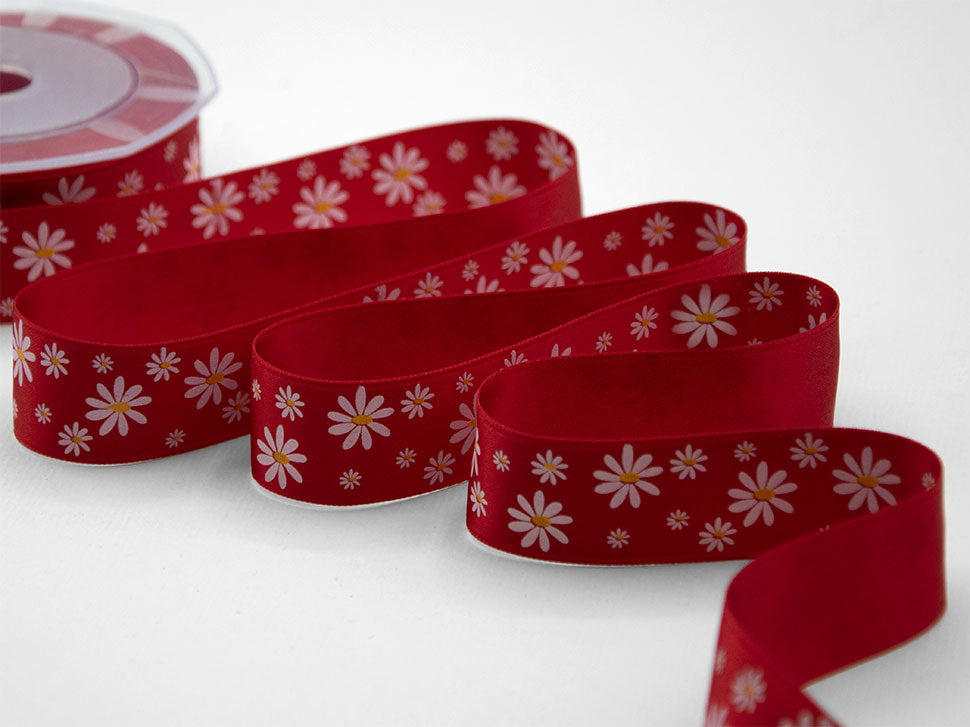 Doppio Raso Stampa Serigraf.25 MM Margherite Bicolor Rosso. Il nastro elegante e raffinato per definizione è il doppio raso, qui è presentato in una variante stampata. È versatile e bello da lavorare e, nella sua semplicità, si presta ad ogni utilizzo. Essendo un prodotto di alta qualità si annoda molto facilmente formando un bel fiocco con le code che presentano un taglio netto e definito, che non si sfilaccia. Il suo aspetto è luminoso, consistente e corposo, ma al tatto è decisamente delicato e setoso. I suoi 25 mm di altezza e le infinite possibilità di personalizzazione lo rendono un nastro ideale per molteplici utilizzi: dalla confezione di bomboniere di matrimoni e cerimonie alla decorazione dei fiori e della tavola; dalle confezioni regalo, anche natalizie, a tutti gli eventi di pregio.. Codice colore# 45/31 - CONFEZIONATO IN BOBINA DA METRI 10