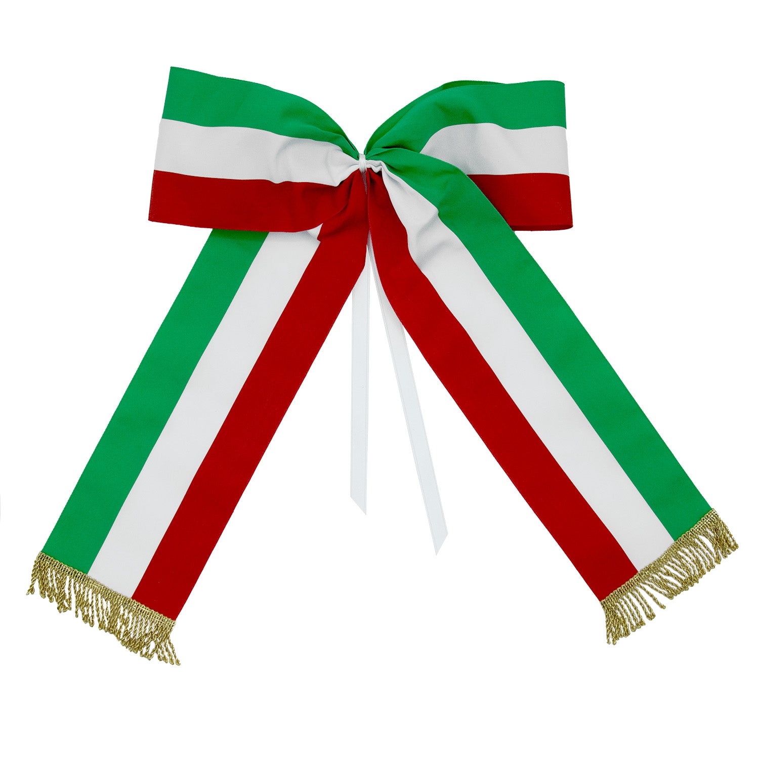 Fiocco tricolore con frange oro 20x42 cm. Confezionato singolarmente.