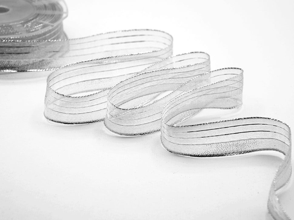 Firenze 26 MM Argento. Un nastro un po' lamé e un po' velo organza, perfetto per l'albero di natale e i pacchi regalo, il Firenze è molto elegante e raffinato. . Codice colore# 101 - CONFEZIONATO IN BOBINA DA METRI 20