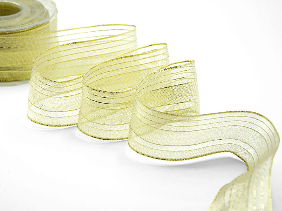 Firenze 46 MM Oro. Un nastro un po' lamé e un po' velo organza, perfetto per l'albero di natale e i pacchi regalo, il Firenze è molto elegante e raffinato. . Codice colore# 102 - CONFEZIONATO IN BOBINA DA METRI 20