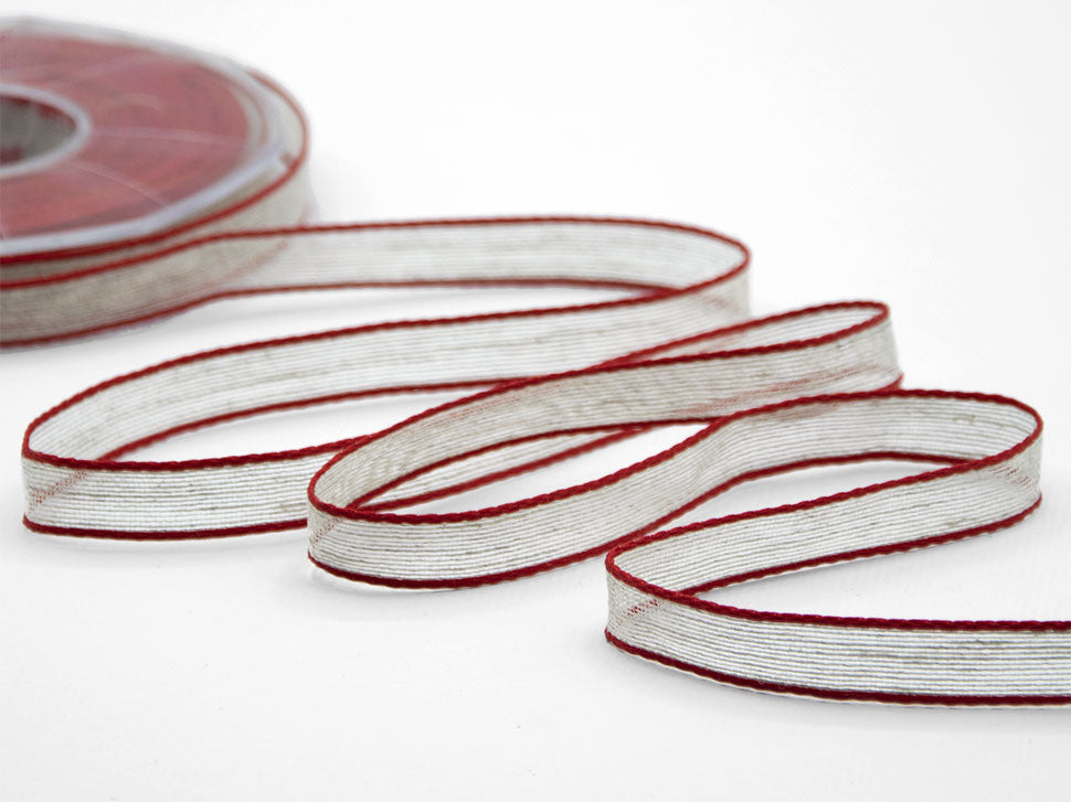 Lino Bordi Colorati Rame 10 MM Rosso. E’ un nastro molto pregiato, in puro lino, sinonimo di natura, ricorda le lenzuola del corredo della nonna. Sembra ruvido, ma non lo è, è molto facile da lavorare. Ha una gamma colori calda, classica e semplice. Dall’apparenza rustica, in realtà è molto elegante e abbina l’antico con il moderno, la tradizione naturale con l’eleganza più raffinata. E’ il complemento ideale per i prodotti artigianali e può essere utilizzato benissimo anche nelle cerimonie più eleganti per le quali è prevista anche una versione lamè. Questo nastro trasmette calore e semplicità. Qui è presentato nella versione con i bordi colorati ed animati col fil di rame. Codice colore# 31 - CONFEZIONATO IN BOBINA DA METRI 15