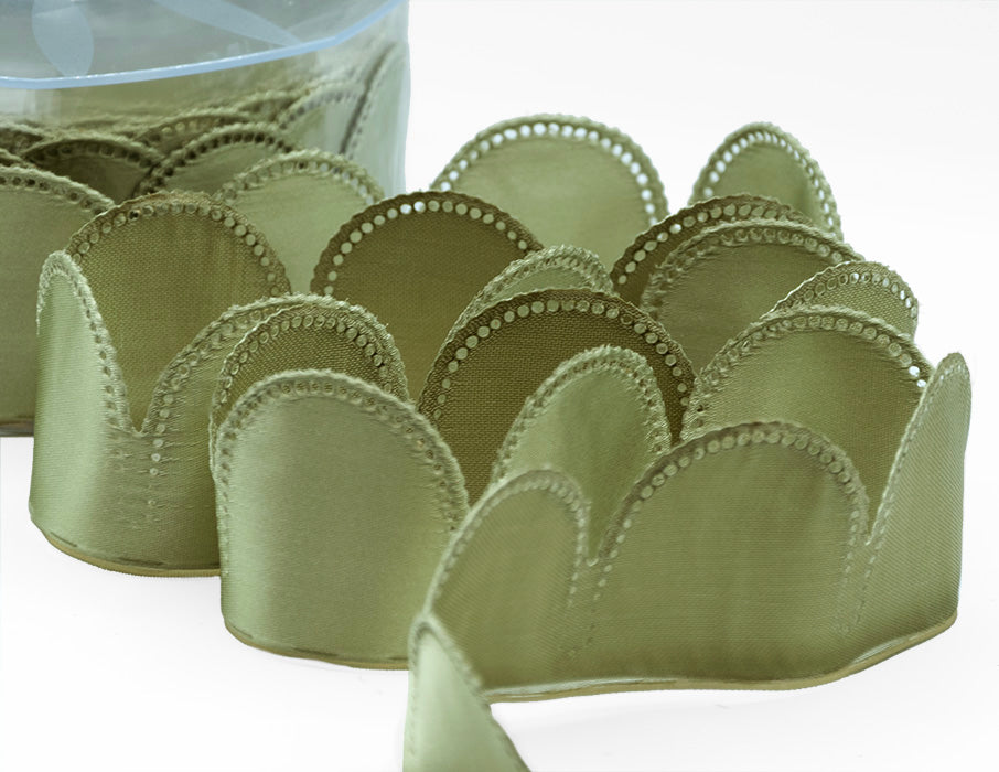 Margherita Portaconfetti 50 MM Verde Salvia. Il nastro portaconfetti permette di confezionare bomboniere o segnaposti in modo semplice e divertente. Venduto a rotolo da 10 o 25 metri, abbiamo calcolato che con una bobina di nastro da 10 metri e l'utilizzo di 5 petali per bomboniera, ovvero 26 cm di nastro portaconfetti, si possono realizzare circa 37 coccarde bomboniere. Facilissimo da lavorare, per confezionare la nostra coccarda basta srotolare il nastro, inserire in ogni petalo un confetto, tagliare il nastro dopo 5 tasche, afferrare i tiranti da entrambi i lati (due per ogni lato) tirare, ottenendo così in un semplice gesto dei bellissimi fiori margherita, con 5 petali e cinque confetti.