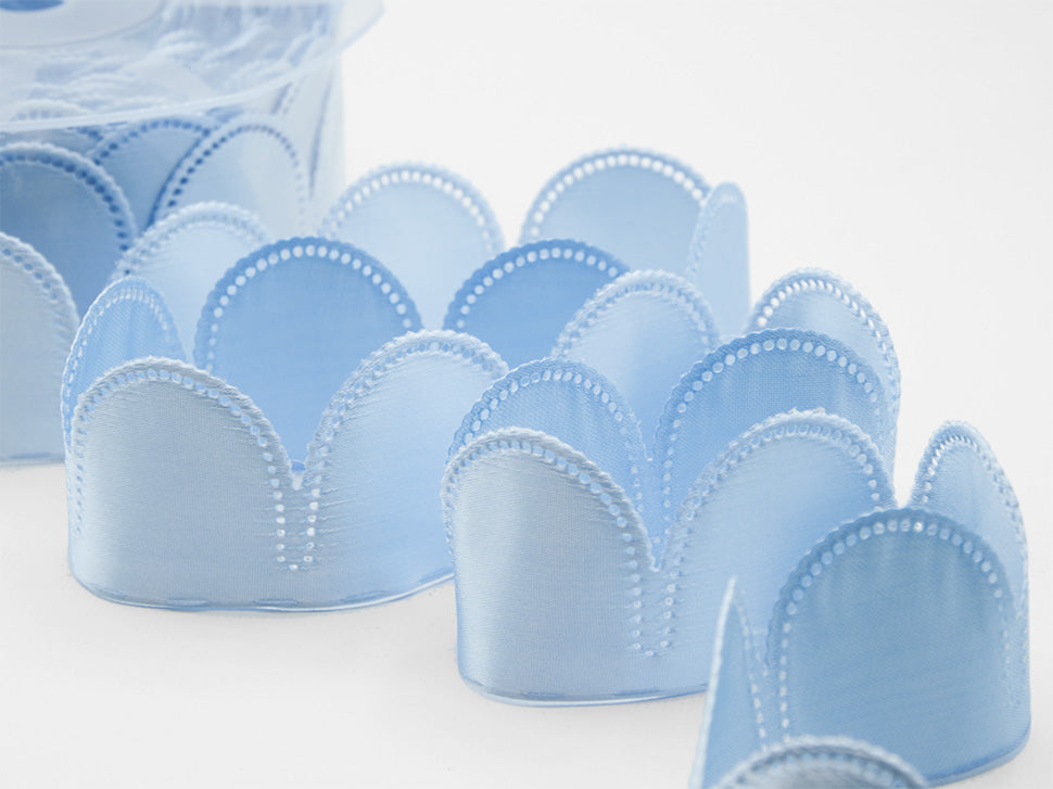 Margherita Portaconfetti 50 MM Azzurro Baby. Il nastro portaconfetti permette di confezionare bomboniere o segnaposti in modo semplice e divertente. Venduto a rotolo da 10 o 25 metri, abbiamo calcolato che con una bobina di nastro da 10 metri e l'utilizzo di 5 petali per bomboniera, ovvero 26 cm di nastro portaconfetti, si possono realizzare circa 37 coccarde bomboniere. Facilissimo da lavorare, per confezionare la nostra coccarda basta srotolare il nastro, inserire in ogni petalo un confetto, tagliare il nastro dopo 5 tasche, afferrare i tiranti da entrambi i lati (due per ogni lato) tirare, ottenendo così in un semplice gesto dei bellissimi fiori margherita, con 5 petali e cinque confetti.