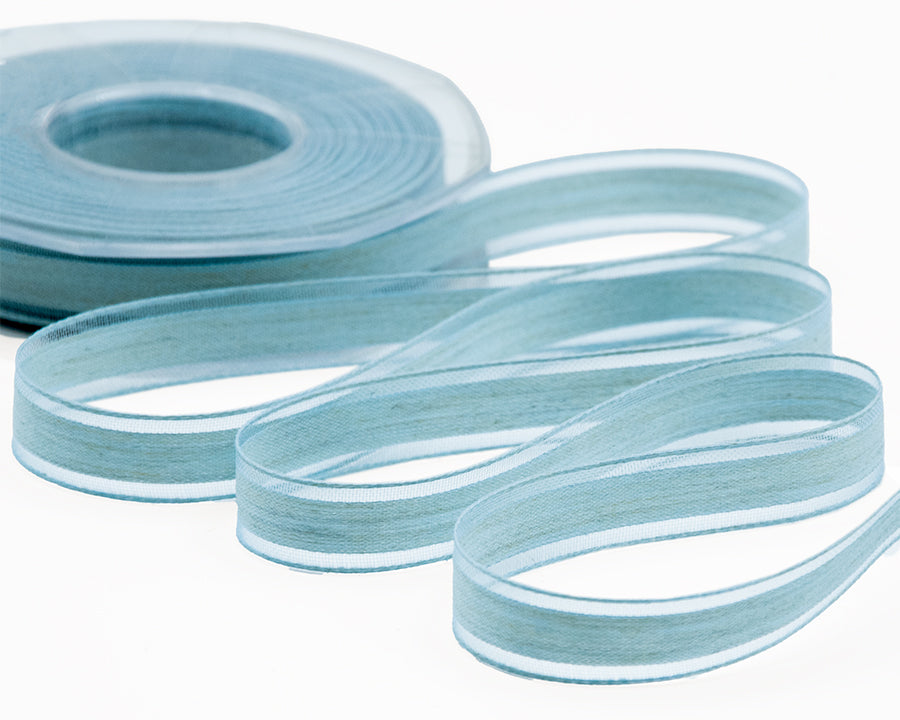 Melange Bordi Velo 15 MM Azzurro Baby. Il nastro mélange con i bordi in velo è un nastro melangiato, ottenuto tramite la tessitura di filati di cotonieri di tonalità diverse tra loro.