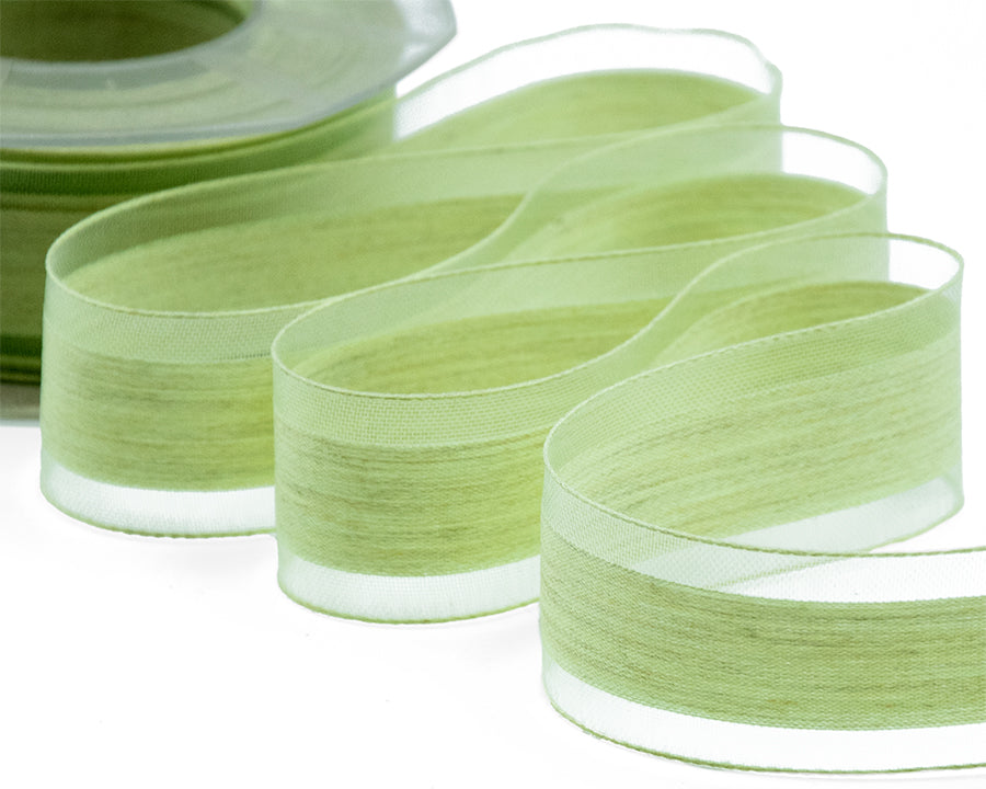 Melange Bordi Velo 45 MM Verde Mela Chiaro. Il nastro mélange con i bordi in velo è un nastro melangiato, ottenuto tramite la tessitura di filati di cotonieri di tonalità diverse tra loro. L’articolo M1040 è un grazioso nastro melange, opaco, morbidissimo, facile da lavorare, ideale per creare fantastiche creazioni shabby chic o vintage, da utilizzare nella decorazione della casa e ai complementi d’arredo perché regalano alla casa un’atmosfera intima e calda che rimanda al passato. Il nastro decorativo in tessuto mélange è adatto anche nella creazioni delle bomboniere: dai battesimi ai matrimoni, e per ogni tipo di cerimonia, per le decorazioni natalizie, per gli addobbi floreali. I bordi trasparenti aggiungono un tocco di eleganza . Codice colore# 549 - CONFEZIONATO IN BOBINA DA METRI 20