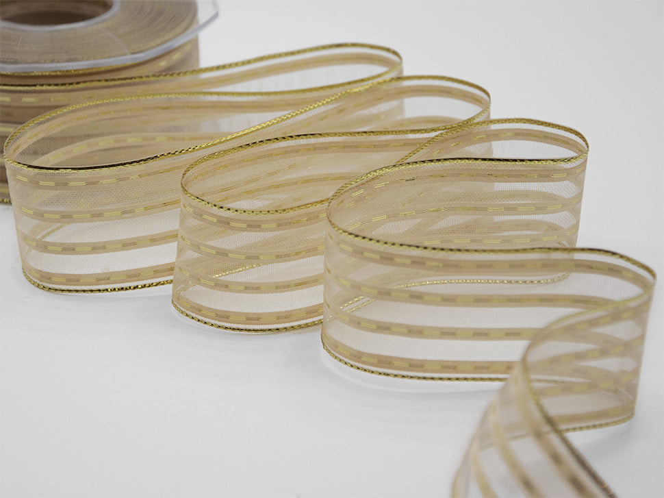 Melody 35 MM Beige. Questo nastro natalizio dai mille colori e con l'impuntura oro è un classico della decorazione delle feste e dei pacchi regalo per Natale. Ha i bordi animati con un ferretto metallico per aiutare la realizzazione delle confezioni e mantenere la forma. Codice colore# 2 - CONFEZIONATO IN BOBINA DA METRI 25