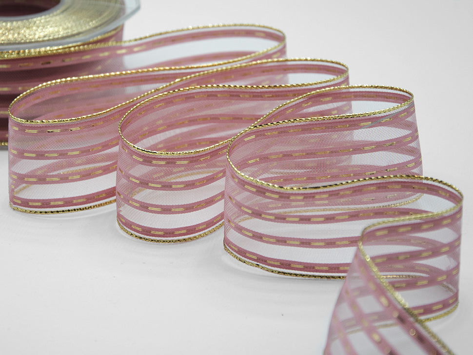 Melody 35 MM Rosa Antico. Questo nastro natalizio dai mille colori e con l'impuntura oro è un classico della decorazione delle feste e dei pacchi regalo per Natale. Ha i bordi animati con un ferretto metallico per aiutare la realizzazione delle confezioni e mantenere la forma. Codice colore# 37 - CONFEZIONATO IN BOBINA DA METRI 25