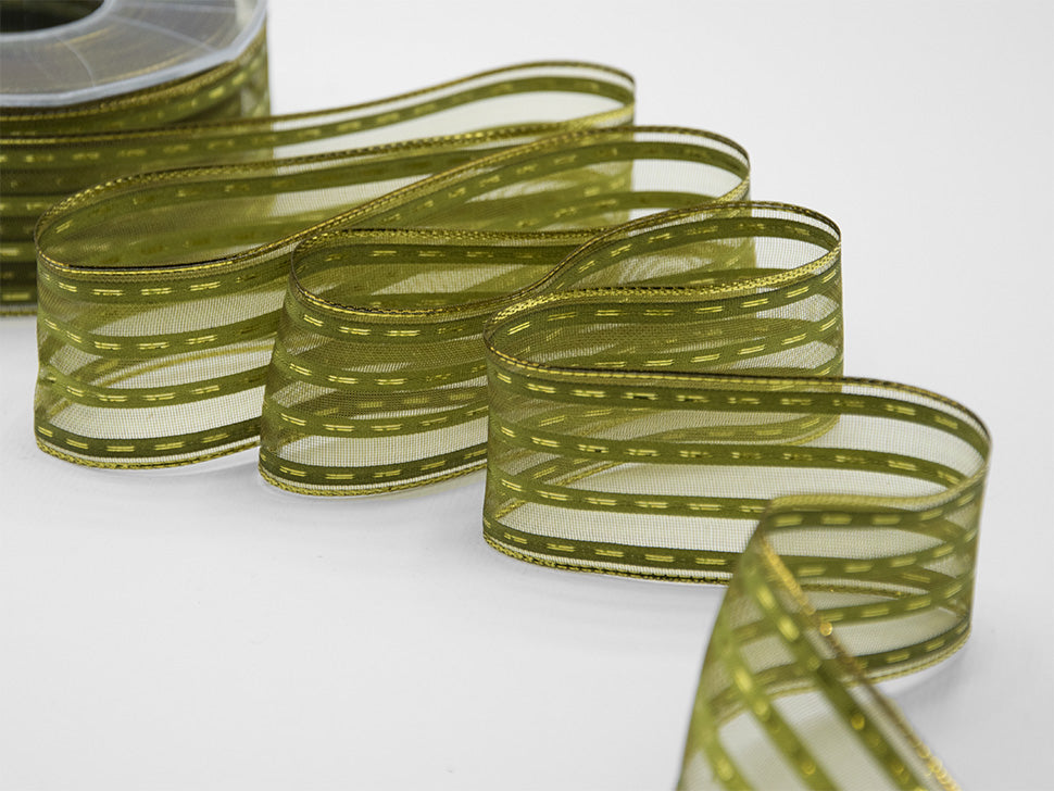 Melody 35 MM Verde Muschio. Questo nastro natalizio dai mille colori e con l'impuntura oro è un classico della decorazione delle feste e dei pacchi regalo per Natale. Ha i bordi animati con un ferretto metallico per aiutare la realizzazione delle confezioni e mantenere la forma. Codice colore# 39 - CONFEZIONATO IN BOBINA DA METRI 25