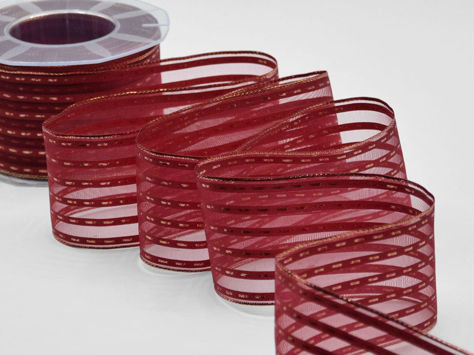 Melody 55 MM Amaranto. Questo nastro natalizio dai mille colori e con l'impuntura oro è un classico della decorazione delle feste e dei pacchi regalo per Natale. Ha i bordi animati con un ferretto metallico per aiutare la realizzazione delle confezioni e mantenere la forma. Codice colore# 46 - CONFEZIONATO IN BOBINA DA METRI 25