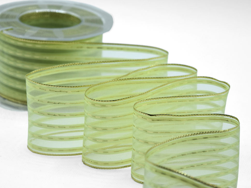 Melody 55 MM Verde Prato. Questo nastro natalizio dai mille colori e con l'impuntura oro è un classico della decorazione delle feste e dei pacchi regalo per Natale. Ha i bordi animati con un ferretto metallico per aiutare la realizzazione delle confezioni e mantenere la forma. Codice colore# 7 - CONFEZIONATO IN BOBINA DA METRI 25