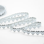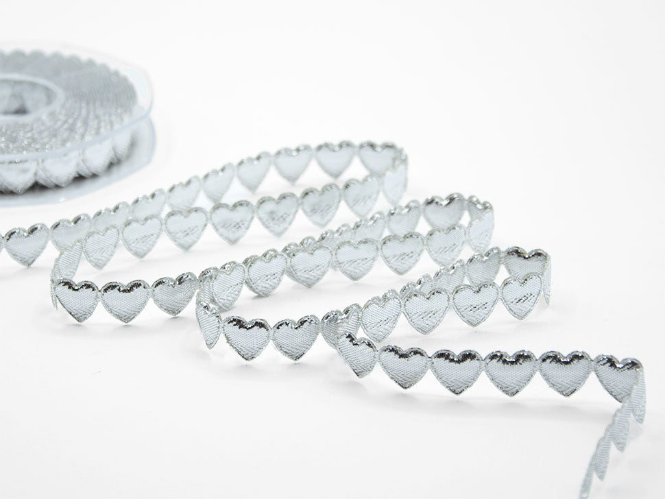 Nastro Con 340 Cuoricini Imbottiti Argento. Nastro con cuoricini imbottiti che si possono tagliare singolarmente, adatto al bricolage, al DIY, per cornici e lavoretti con la colla a caldo, si può applicare a vasetti di vetro, legno, cartoncini e biglietti d'auguri. Codice colore# 101 - CONFEZIONATO IN BOBINA DA METRI 5