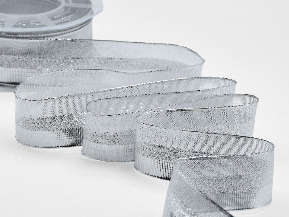 Nettuno 33 MM Argento. Un nastro un po' lamé e un po' taffetà, perfetto per l'albero di natale e i pacchi regalo, il Nettuno è molto elegante e raffinato, caratterizzato da un'armatura a tre zone differenziate, sembra di lavorare tre nastri distinti. Codice colore# 101 - CONFEZIONATO IN BOBINA DA METRI 20