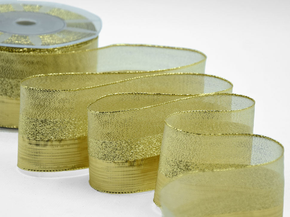 Nettuno 50 MM Oro. Un nastro un po' lamé e un po' taffetà, perfetto per l'albero di natale e i pacchi regalo, il Nettuno è molto elegante e raffinato, caratterizzato da un'armatura a tre zone differenziate, sembra di lavorare tre nastri distinti. Codice colore# 102 - CONFEZIONATO IN BOBINA DA METRI 20